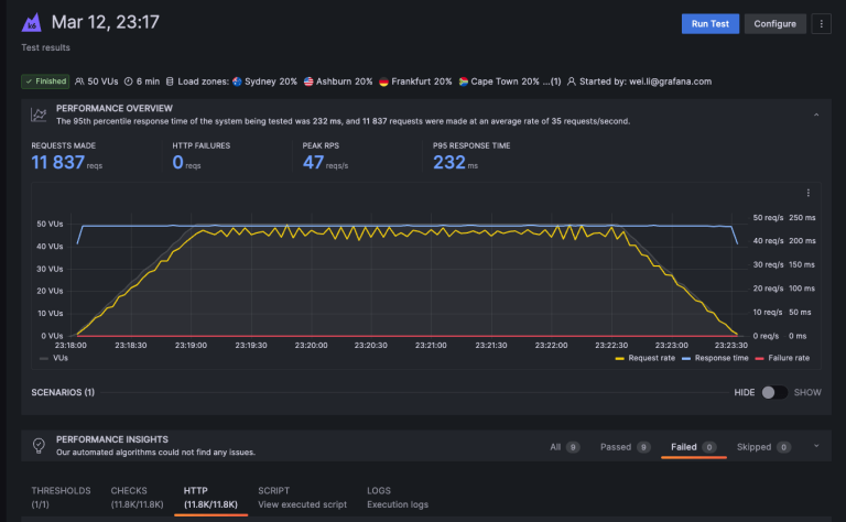 Bei dieser Grafik wurden 11.837 Anfragen bei einer Spitzenlast von 47 Anfragen pro Sekunde (RPS) durchgeführt, ohne HTTP-Fehler, und die 95. Perzentil-Antwortzeit beträgt 232 ms. Die Grafik visualisiert die Anzahl der virtuellen Nutzer (VU) sowie die Anfragen pro Sekunde (gelbe Linie) und die Antwortzeit (blaue Linie) über die Zeit, wobei das System stabil und ohne Fehler performt hat.